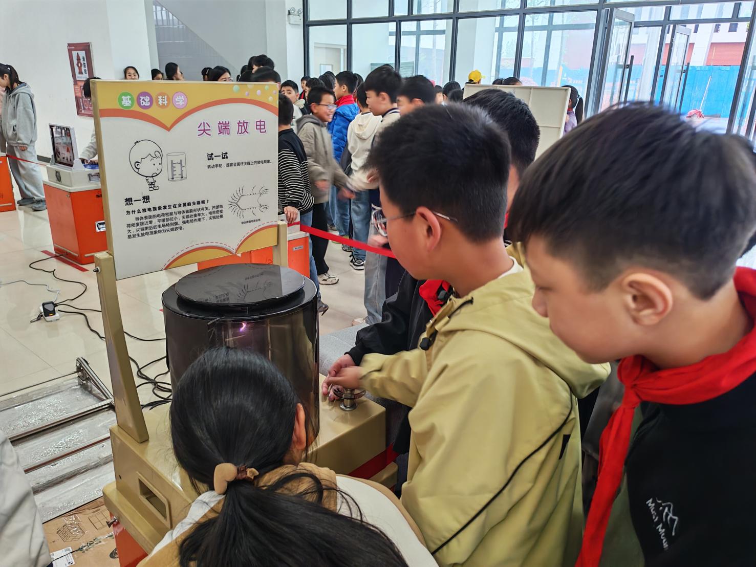 在沉浸式探索环节,每个孩子都被“铿锵锣鼓”“尖端放电”“窥视无穷”等科普大篷车车载展台深深吸引,通过动手探索直观了解声、光、电、磁等领域的科学知识。