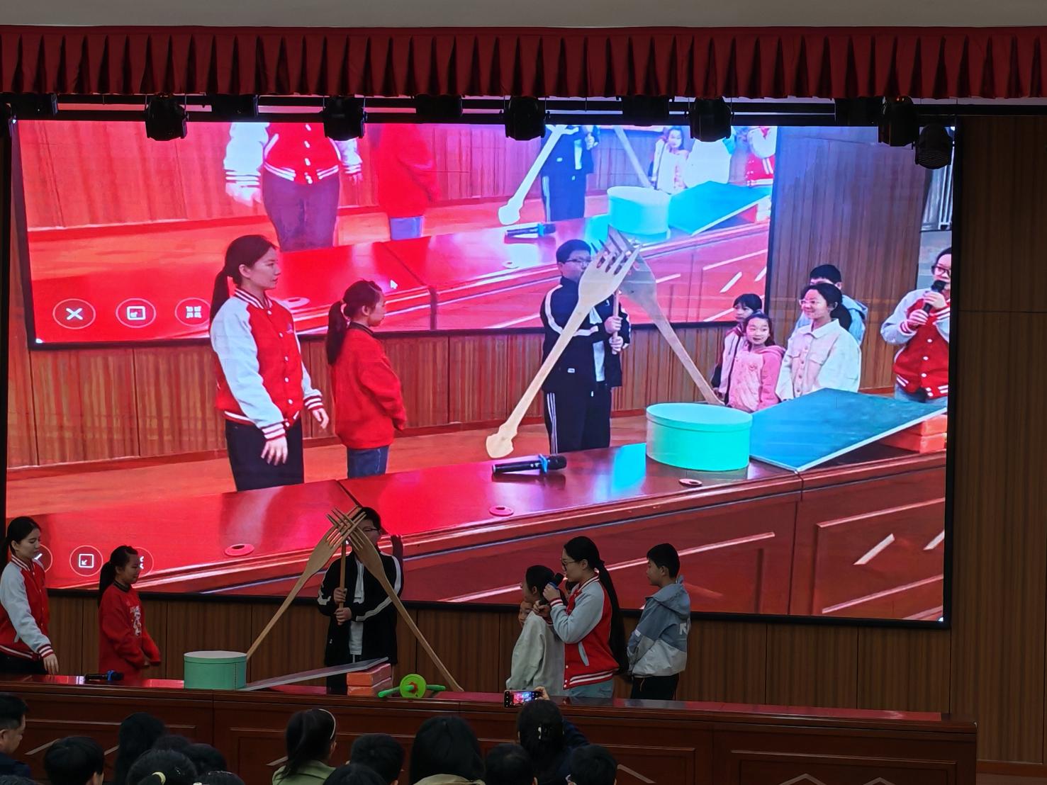 在“神奇的平衡”科普秀环节,科技馆老师展示了多个趣味平衡实验,并邀请孩子们上台参与互动体验。孩子们亲身探寻“滚轴上坡”“木棍平衡叉子”等现象背后的科学原理,感受到科学与生活的紧密联系。